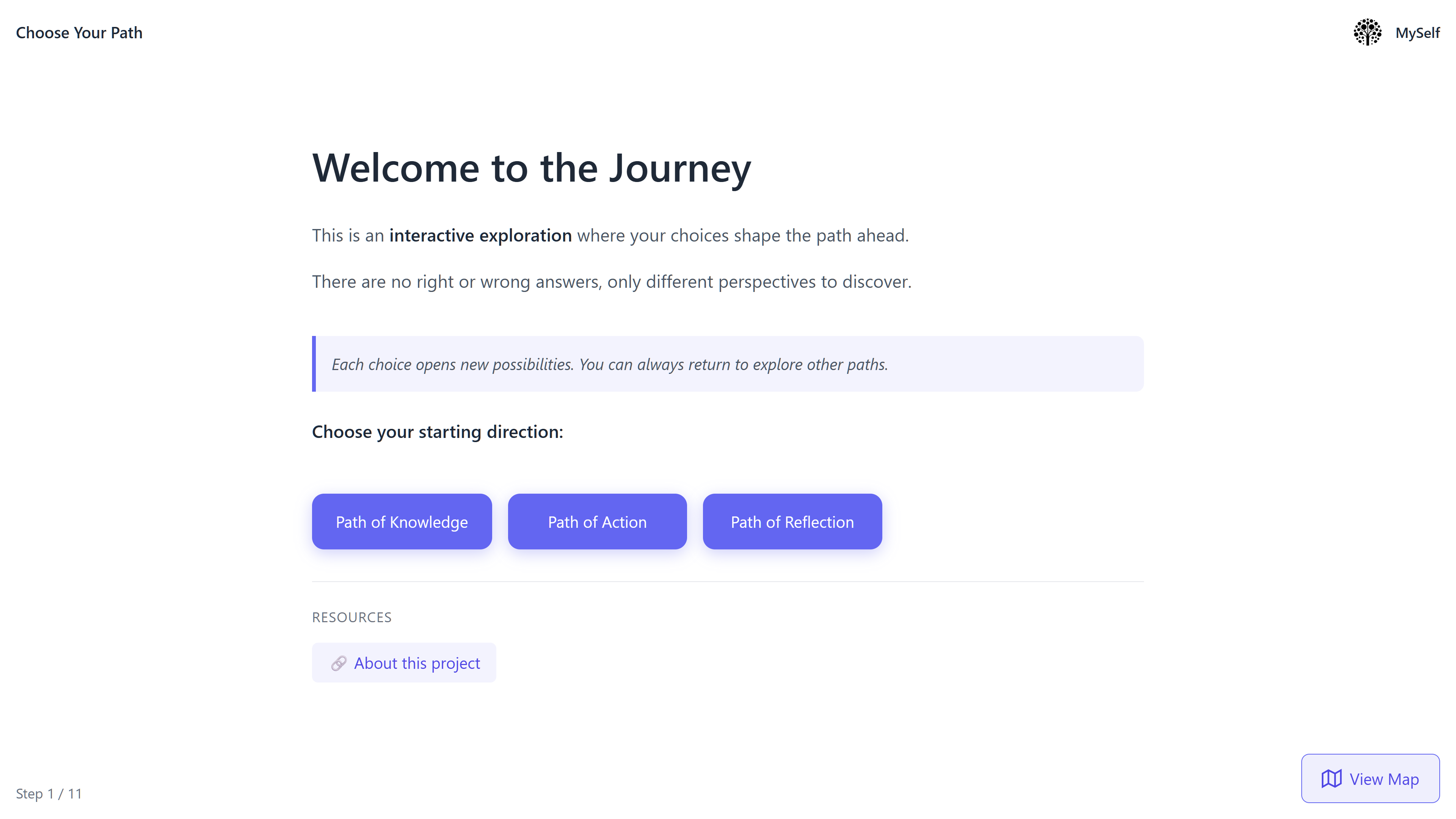 Users see a series of cards with multiple choices leading to different paths. At any time, they can open the visual map to see the complete structure, visited nodes, and current position. This dual mode—guided navigation and overview—reduces the disorientation typical of branching content.
