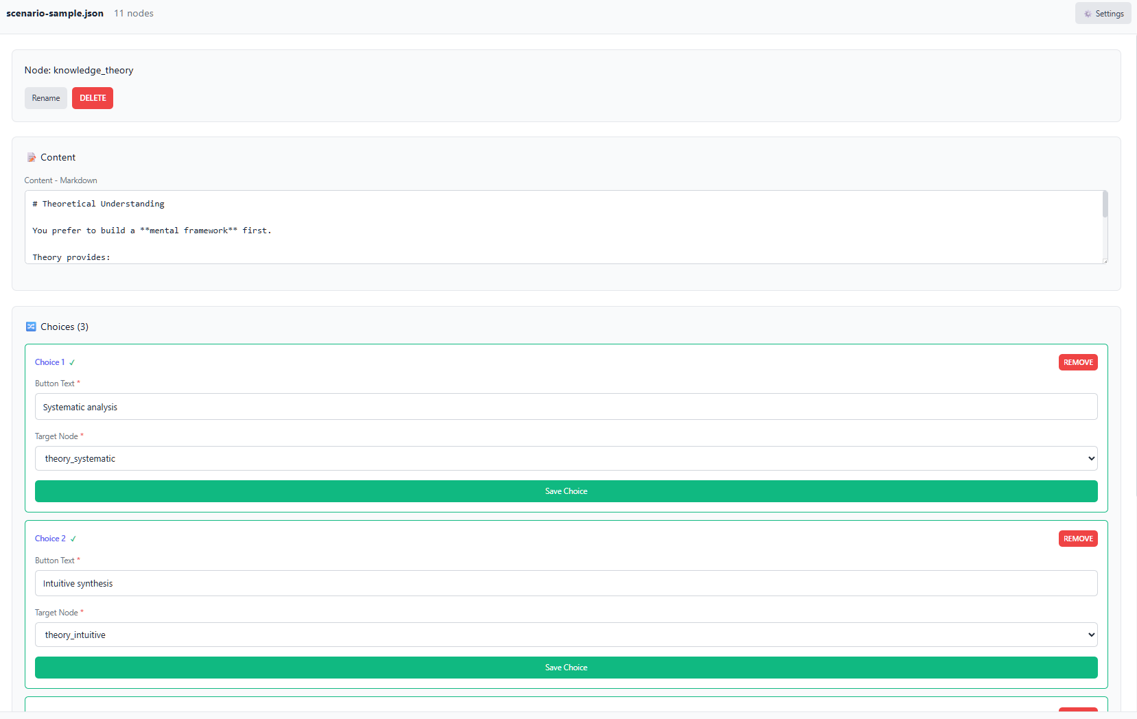 A scenario is the set of nodes (which the user sees as cards in the Navigator) and connections between nodes (which the user sees as choice buttons within the cards). Scenarios are saved as JSON files.