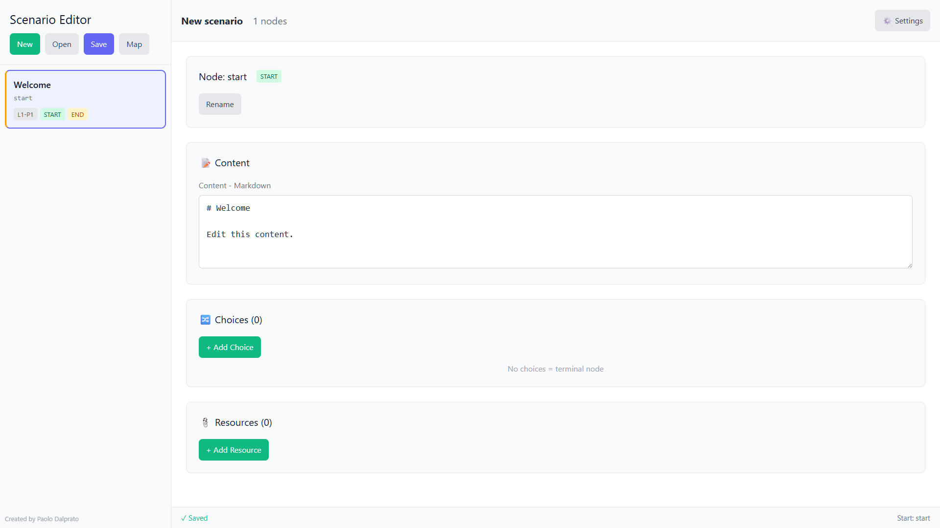 Below the button row appears the list of nodes that are part of the open scenario: only the Start node if starting with a new scenario, a complete list if you're already advanced in creation or if you open an existing scenario.