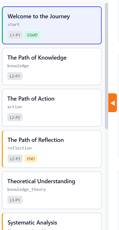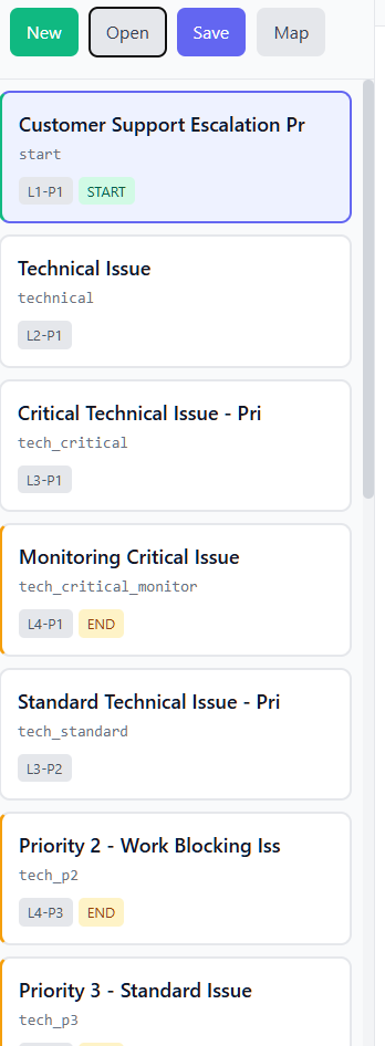 - informational badges: level and position (e.g., L2-P1), START for the initial node, END for terminal nodes