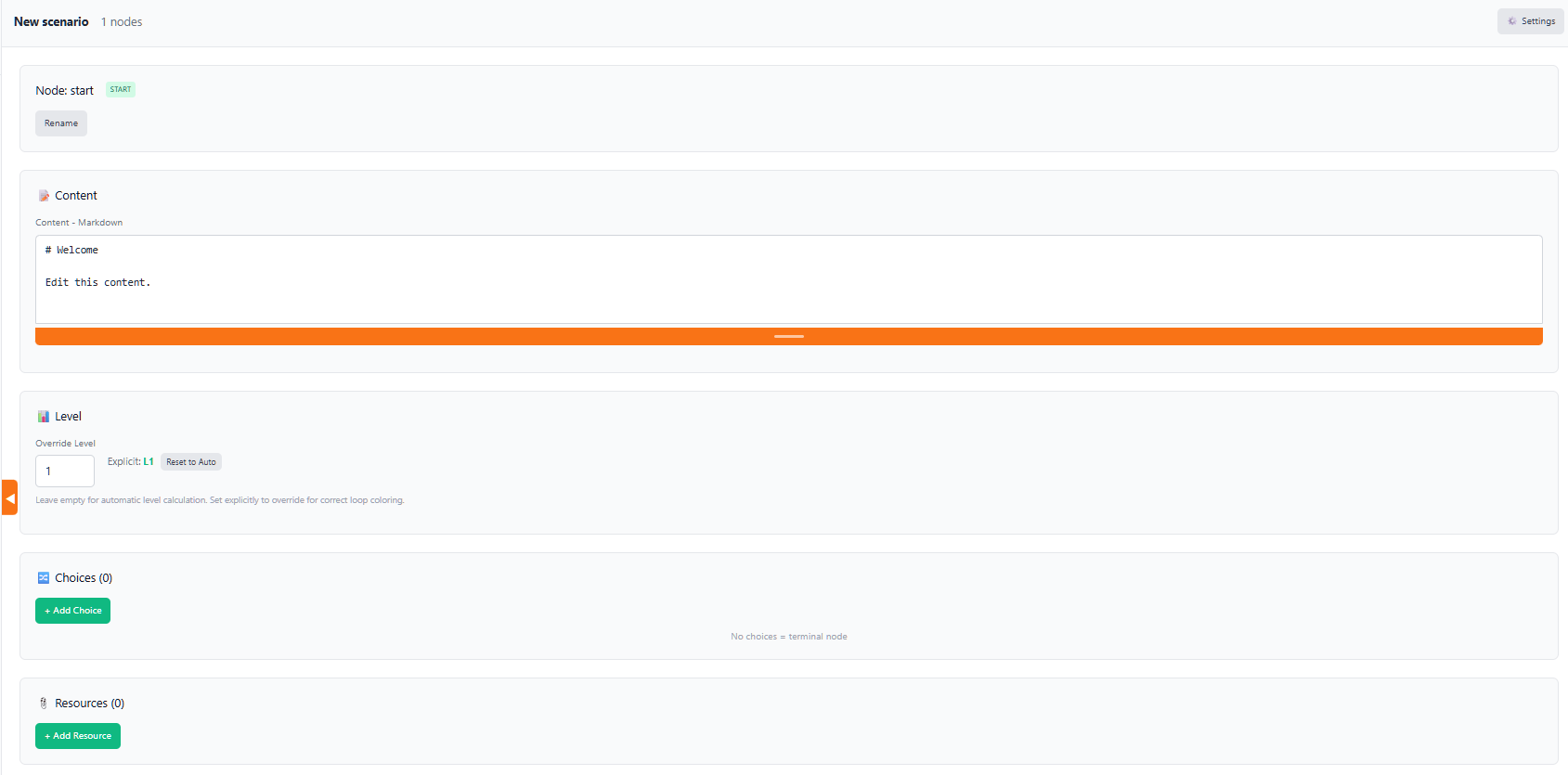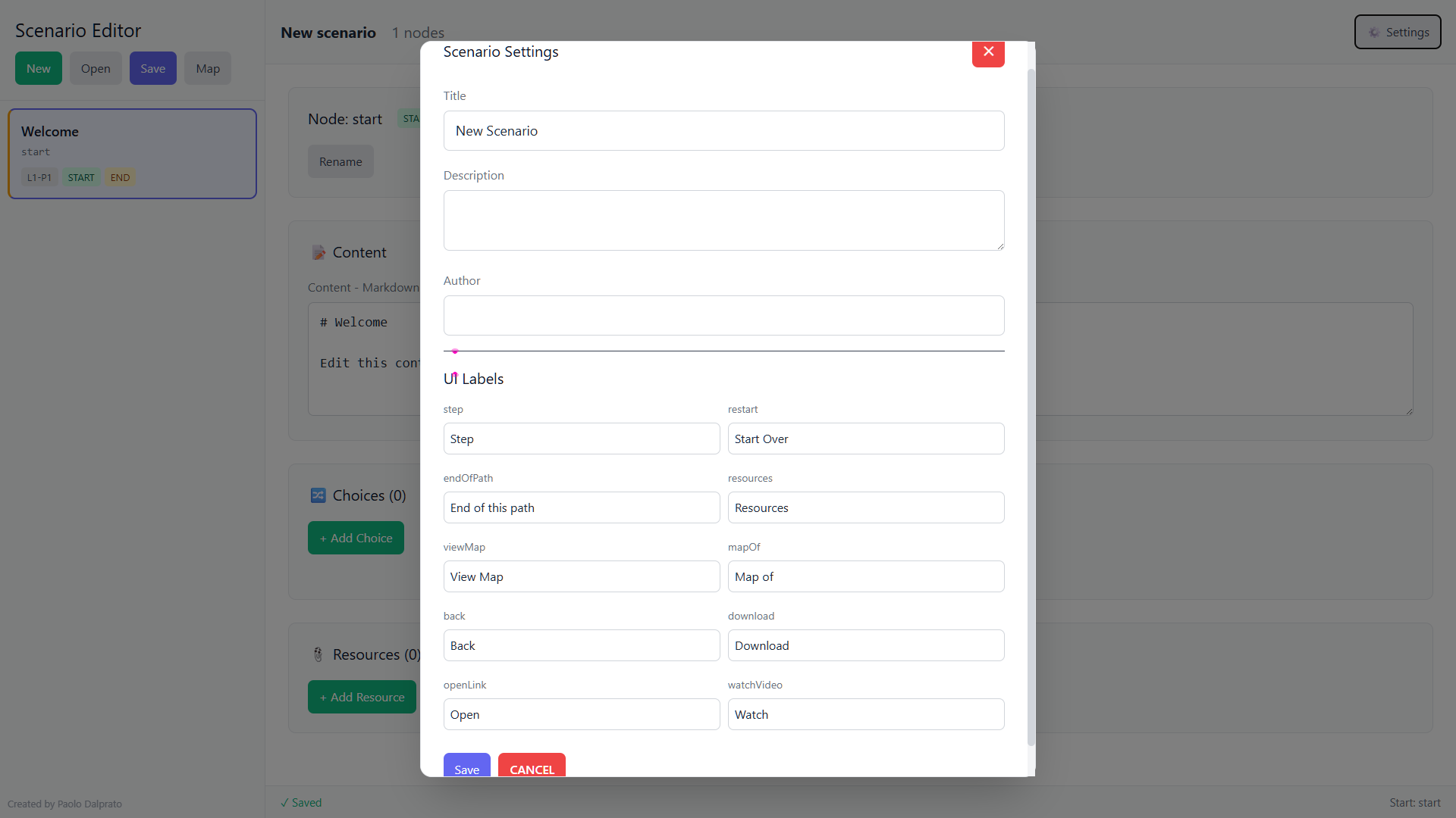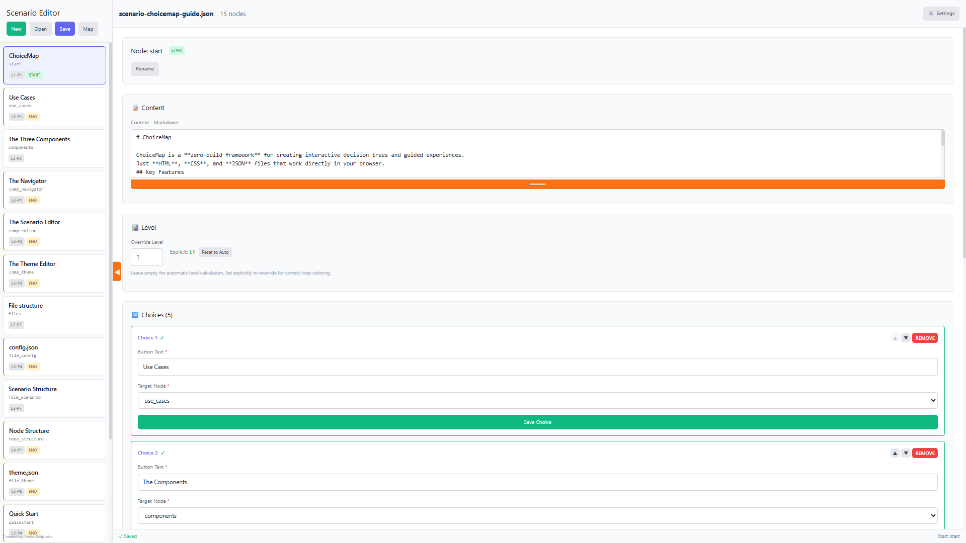 The Scenario Editor is the tool for creating and modifying scenarios. A scenario is the set of nodes (which the user sees as cards in the Navigator) and connections between nodes (which the user sees as choice buttons within the cards). Scenarios are saved as JSON files. The scenario editor has two modes: the edit mode, in which the elements can be viewed as editable blocks, or as a navigable map.