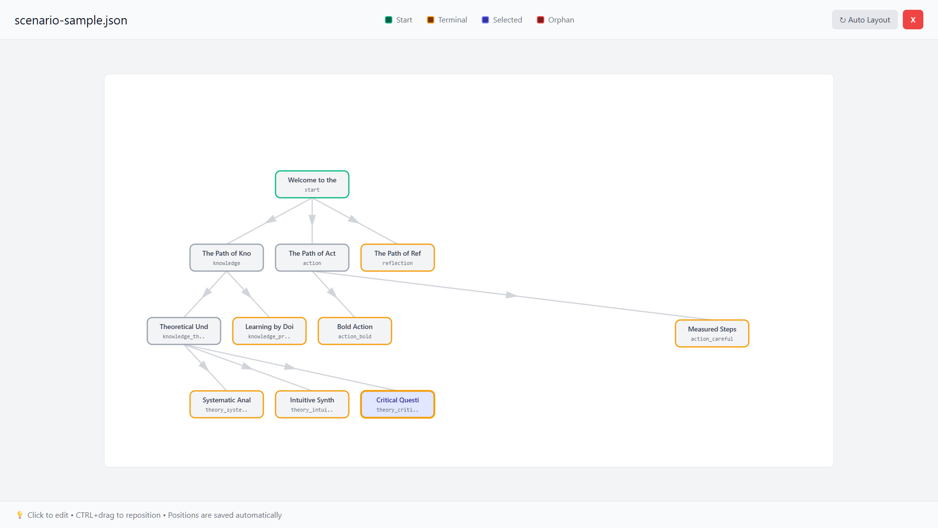 Node movement: holding CTRL (or CMD on macOS) you can drag nodes to customize the layout. Positions automatically snap to a 20px grid for clean and aligned layouts. The "Auto Layout" button restores automatic positioning, aligning nodes at the same level.