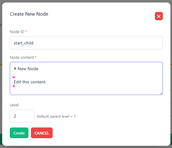 - Level: the node's level in the hierarchy (defaults to parent level + 1, can be modified)