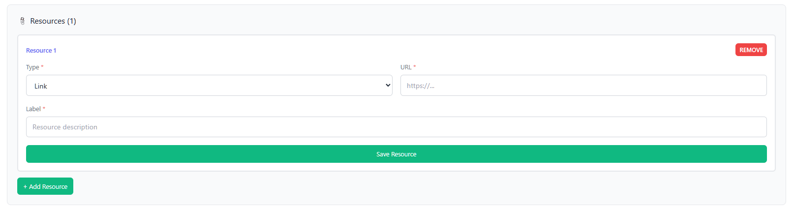 Clicking + Add Resource adds a resource with three required fields: