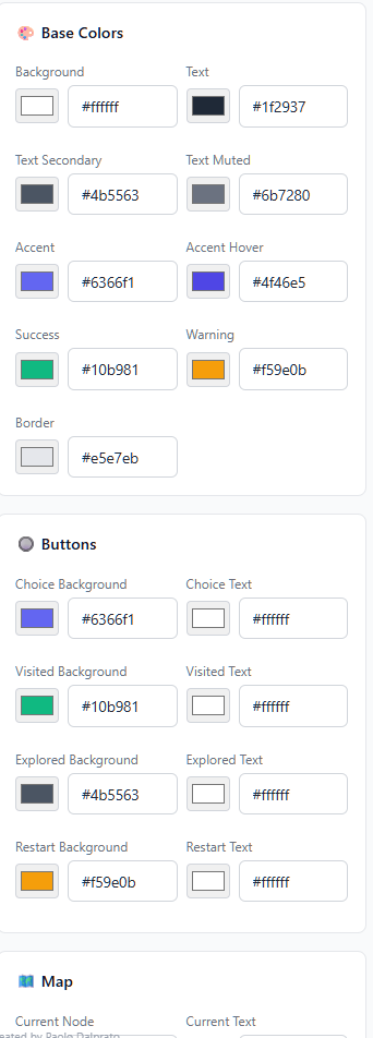 - Buttons: choice buttons have separate controls for each state: background color and text color for unexplored choices, for choices already made, for choices explored but not in the current path. This chromatic distinction helps the user understand what they've already seen when going back to explore alternative paths. The restart button has its own colors, typically different from choice buttons to visually distinguish it.
