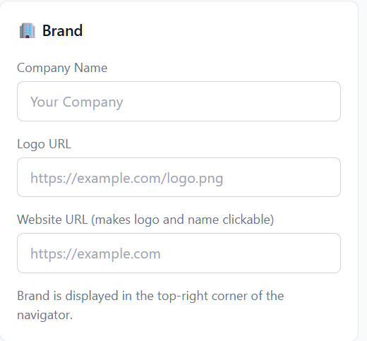 The brand section controls the corporate identity elements that appear in the Navigator in the top right corner.