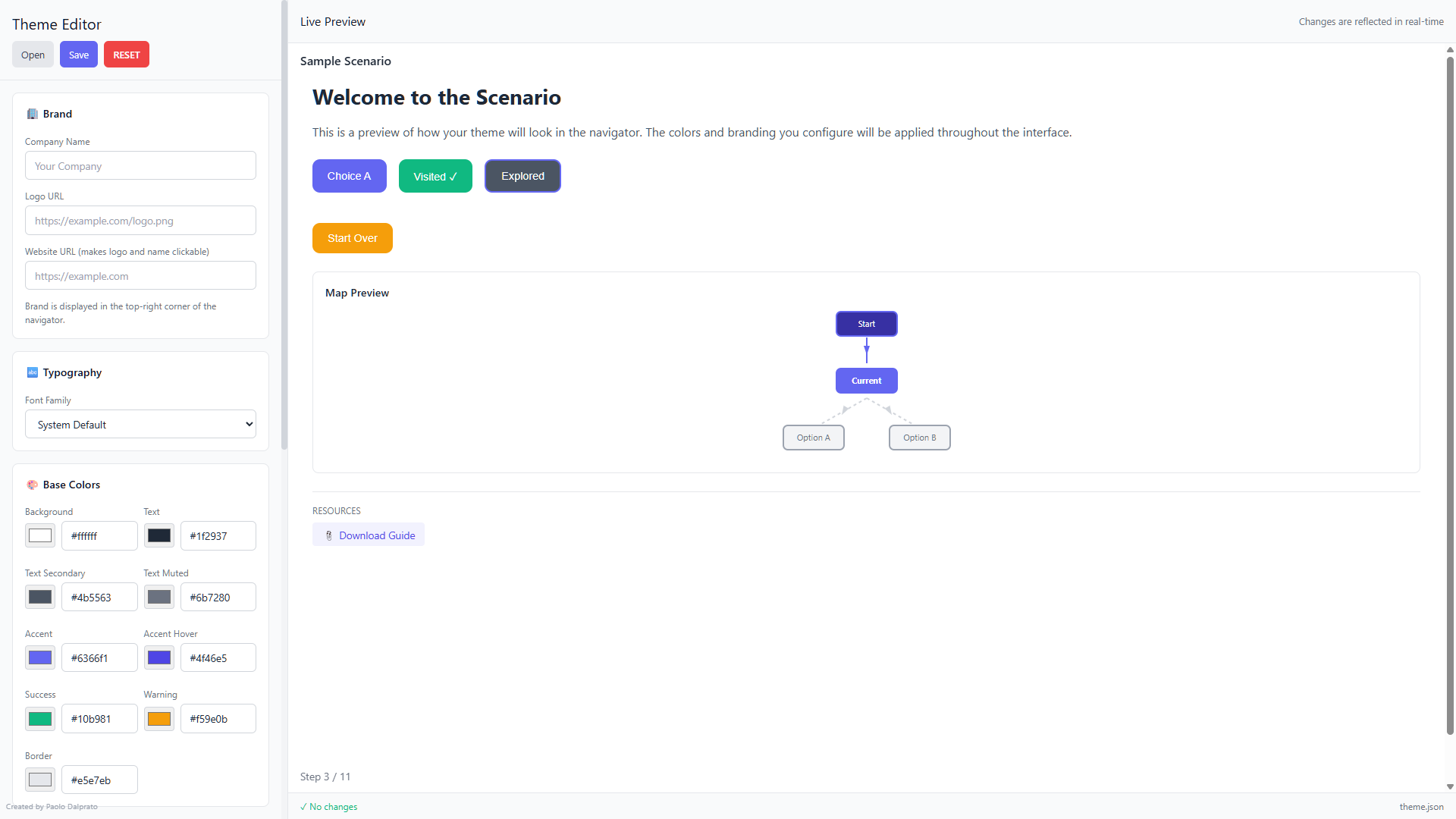 The Theme Editor allows customizing the Navigator's visual appearance without modifying code. Every change is immediately reflected in a preview, allowing you to see the final result while working. The theme is saved in a JSON file.