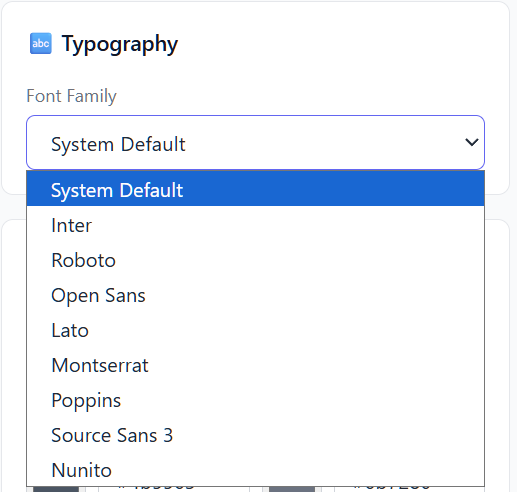 The other options are Google Fonts: - Inter - Roboto - Open Sans - Lato - Montserrat - Poppins - Source Sans 3 - Nunito