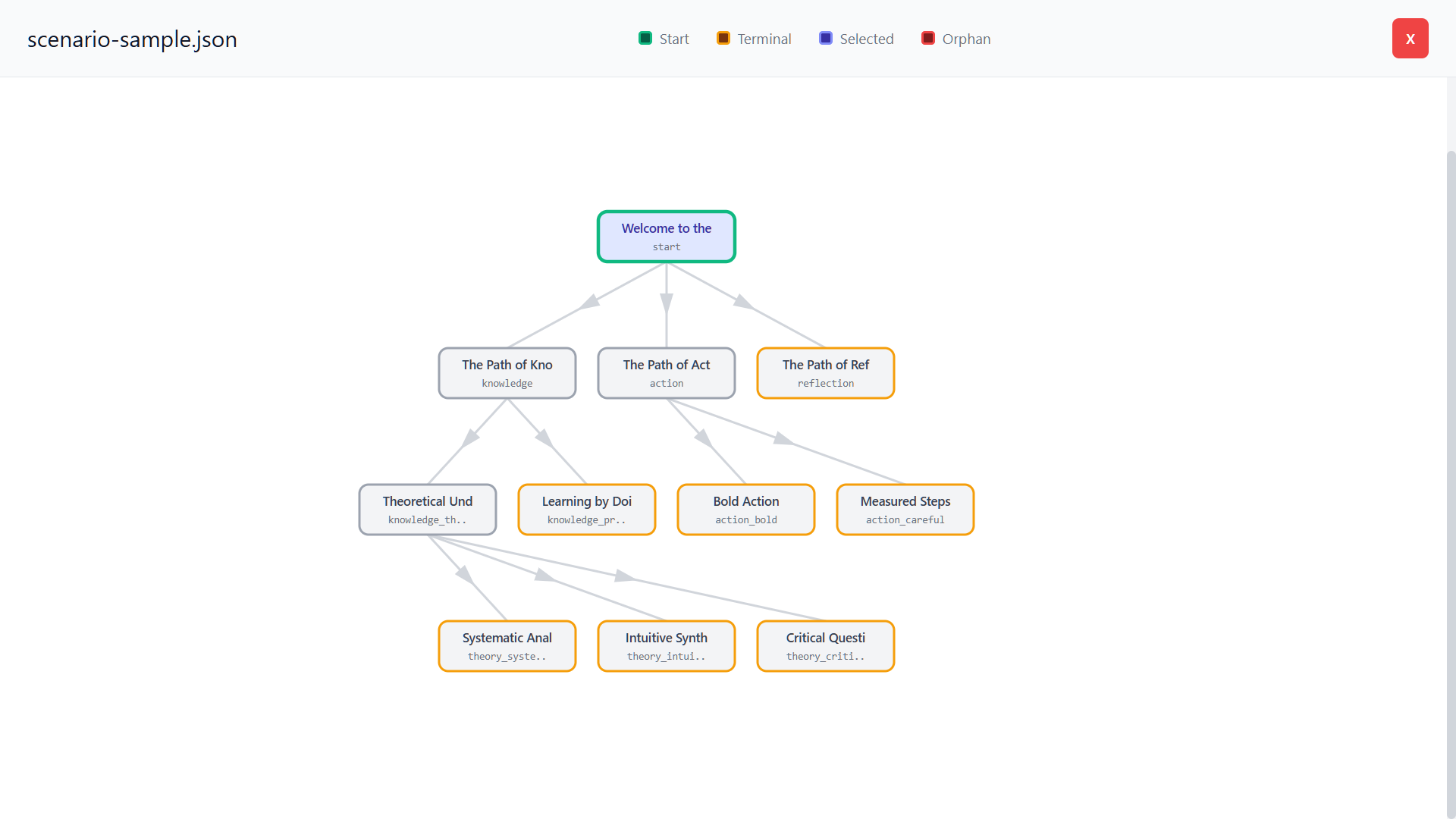 È lo strumento per creare e modificare scenari senza scrivere JSON a mano. Se si apre per modificarlo uno scenario esistente, l'editor presenta una lista di tutti i nodi, permette di modificarne il contenuto, aggiungere scelte, collegare nodi tra loro.
