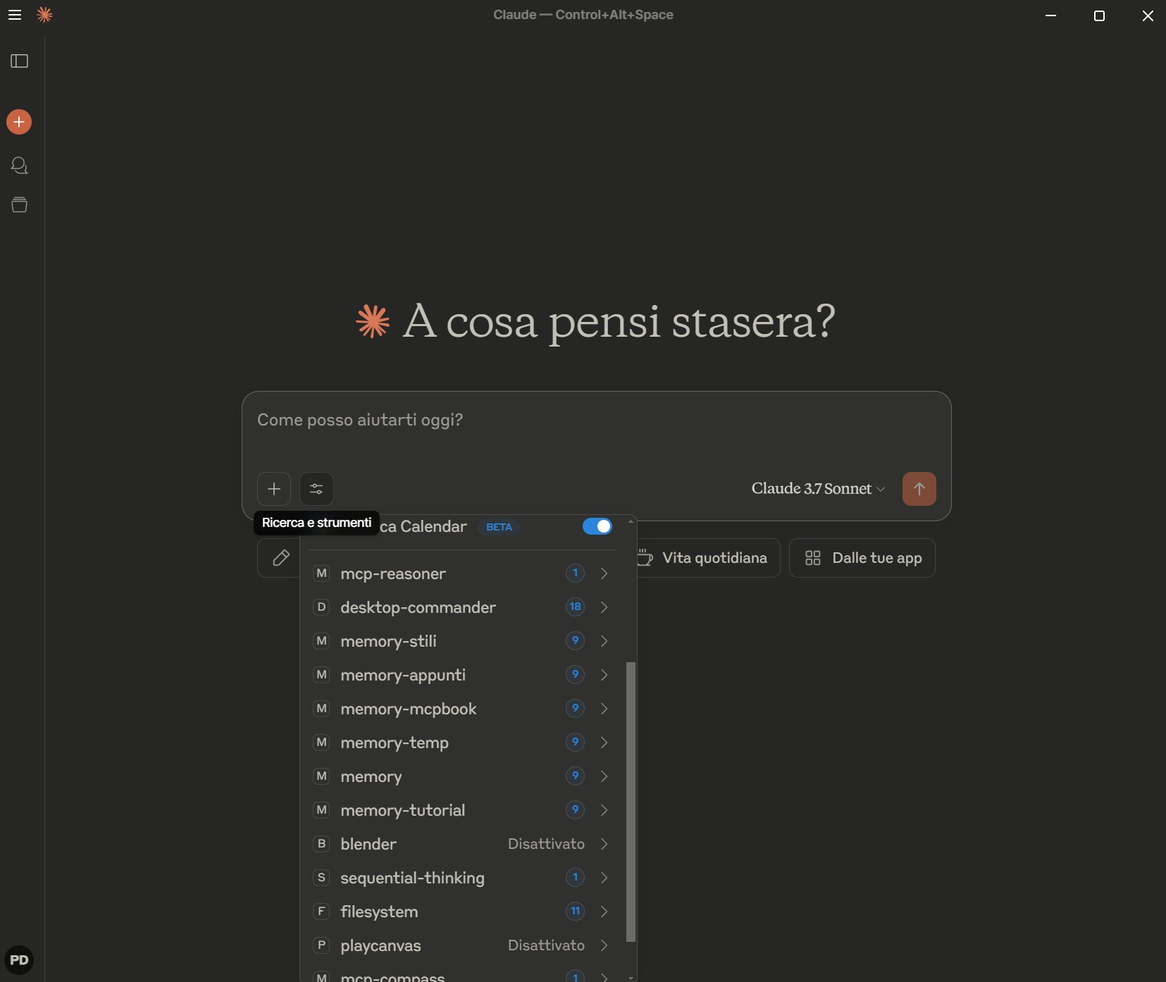Fai clic sull'icona "Ricerca e strumenti" (quella con le due linee orizzontali) per aprire un menu a discesa. Oltre alle voci presenti quando si usa l'interfaccia web, qui compare anche l'elenco dei server MCP configurati.