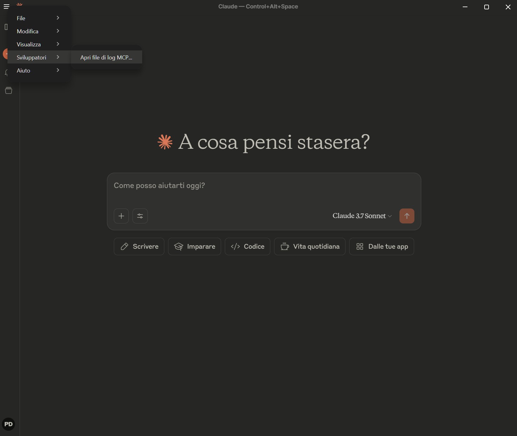 Salva il file, riavvia Claude Desktop e verifica che l'elenco dei server nel menu "Ricerca e strumenti" sia vuoto.