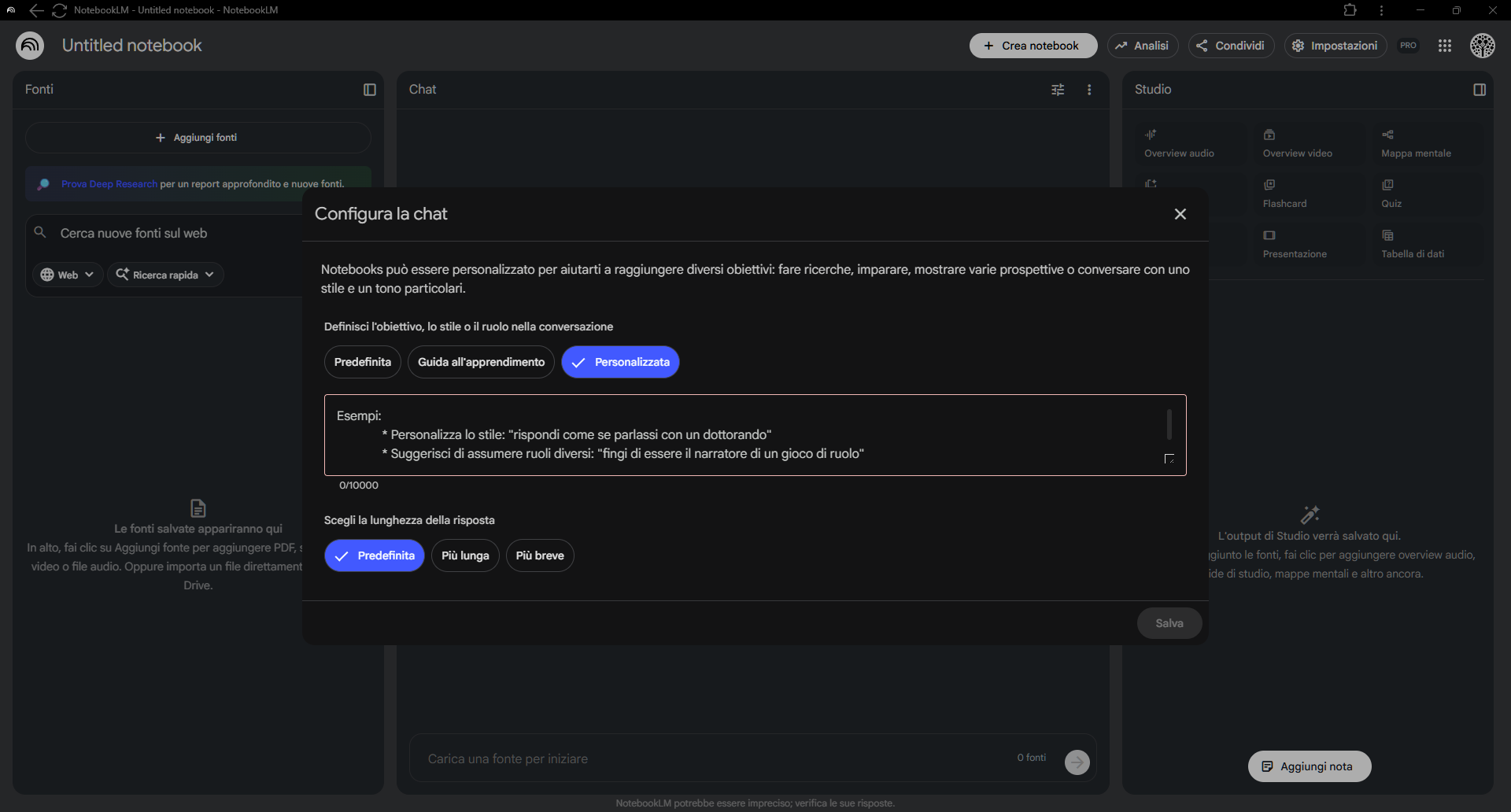 - Personalizzata: permette di definire agevolmente un vero e proprio prompt di sistema del notebook, fino a 10.000 caratteri. Queste istruzioni possono includere: