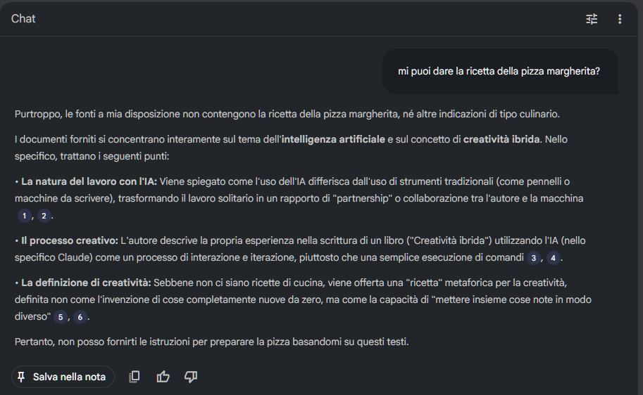 Come è già stato detto il sistema permette di interagire solo con le fonti caricate dall'utente, questo permette un controllo molto forte delle cosiddette allucinazioni. Infatti a fronte di domande su argomenti non contenuti nelle fonti, NotebookLM risponde di non poter soddisfare la richiesta per mancanza di informazioni. Questo approccio riduce il rischio di informazioni non verificabili, va ricordato che in ogni caso la verifica di quanto prodotto dall'AI è responsabilità dell'utente.