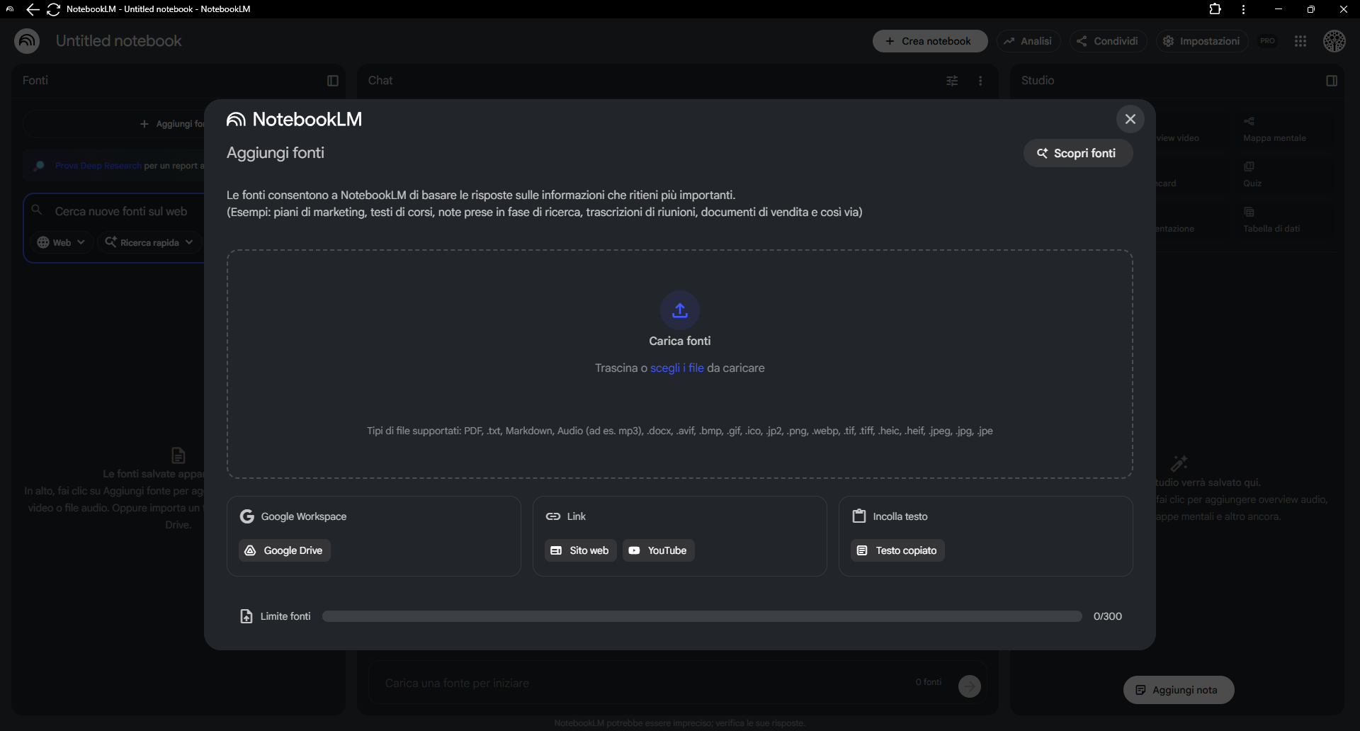 Contenuti multimediali: NotebookLM genera automaticamente trascrizioni di video e audio, trasformandoli in testo analizzabile. Contenuti puramente musicali, senza dialoghi o narrazioni, non possono essere elaborati efficacemente poiché il sistema lavora esclusivamente con informazioni testuali.