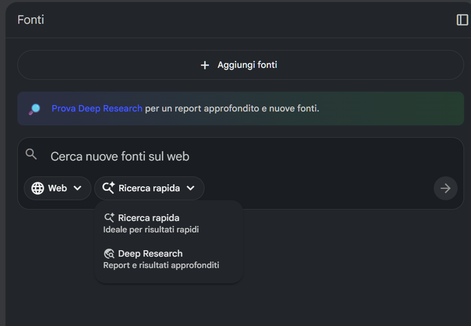 - Il secondo definisce il tipo di ricerca: Ricerca rapida oppure Deep Research per un'analisi più approfondita