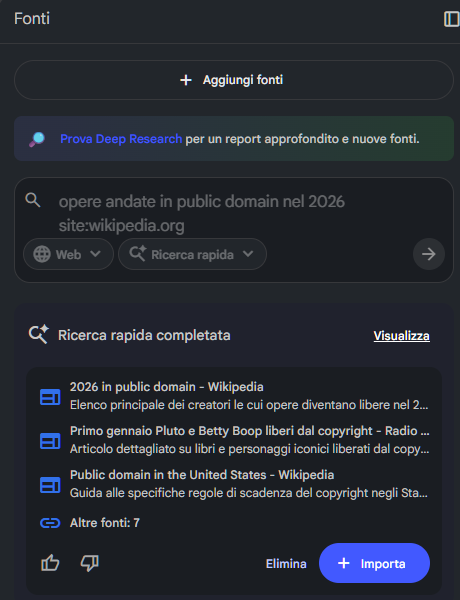 Sotto il pulsante di aggiunta si trova la sezione per la ricerca di fonti sul web, che funziona come un motore di ricerca con un campo per definire il prompt testuale.