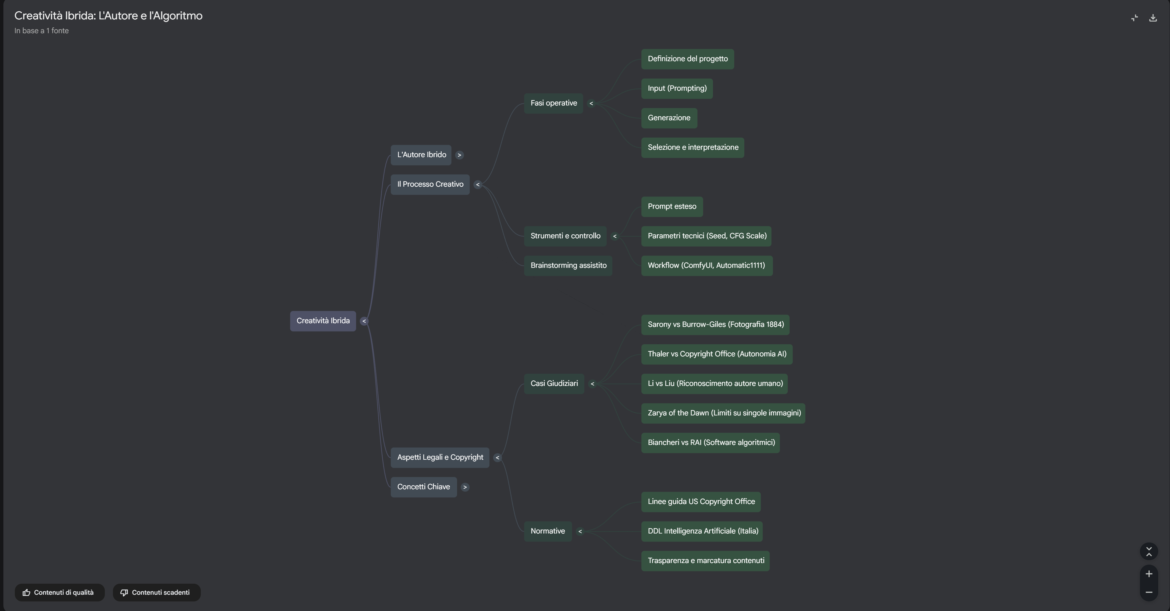 La mappa mentale genera una rappresentazione grafica delle relazioni tra i concetti chiave presenti nelle fonti. È l'unico strumento della sezione Studio che non permette personalizzazione, ma offre una visualizzazione particolarmente utile per ottenere una panoramica dei contenuti e identificare connessioni non immediatamente evidenti nella lettura lineare.