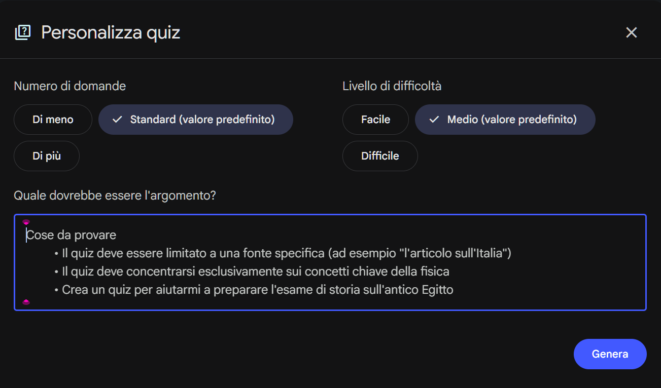 Prompt personalizzato: permette di specificare l'argomento del quiz. Ad esempio si può limitare il quiz a una fonte specifica, concentrarsi sui concetti chiave di un argomento o creare un quiz per preparare un esame su un tema particolare.