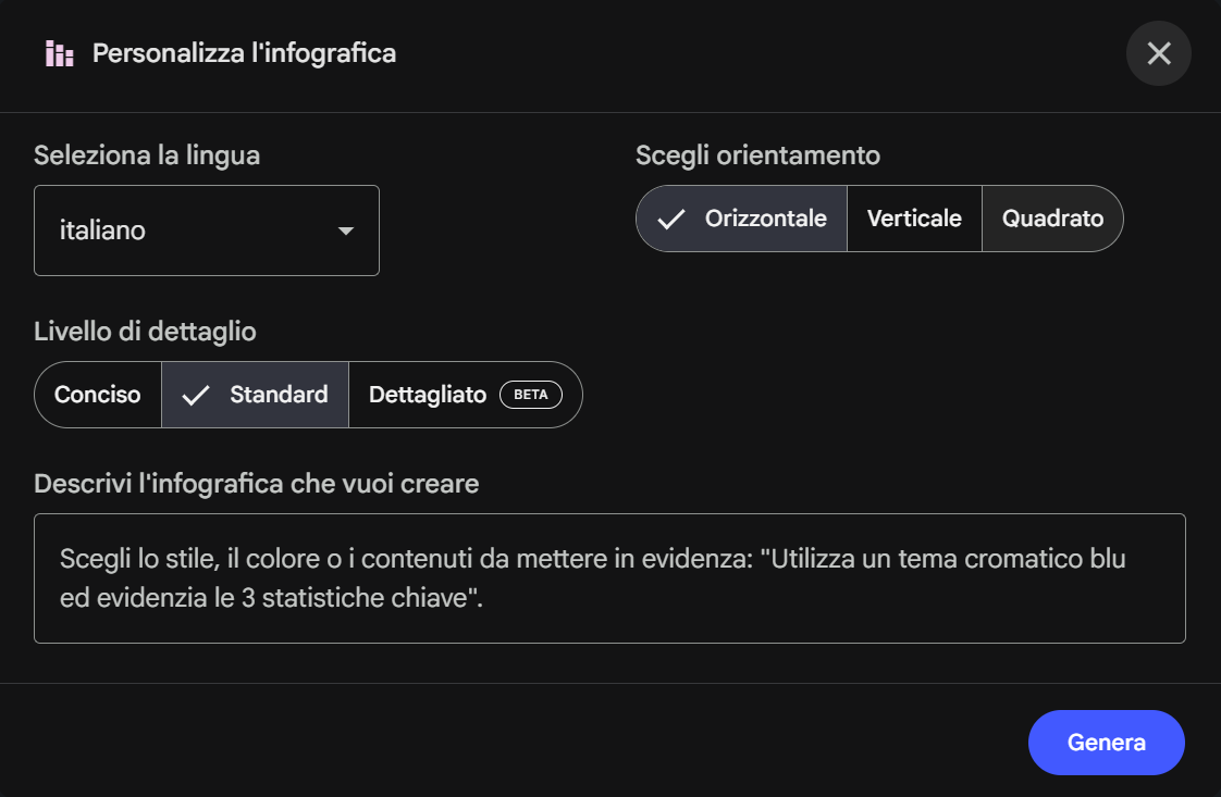 Prompt personalizzato: permette di descrivere l'infografica desiderata, specificando stile, colori o contenuti da evidenziare. Ad esempio si può richiedere un tema cromatico specifico e indicare quali statistiche mettere in risalto.