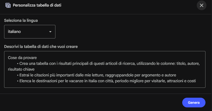 Prompt personalizzato: permette di descrivere la tabella desiderata, specificando le colonne e il tipo di informazioni da estrarre. Ad esempio si può richiedere una tabella con i risultati principali di articoli di ricerca organizzati per titolo, autore e risultato chiave; oppure estrarre citazioni raggruppate per argomento e autore; o ancora creare un elenco di elementi con caratteristiche specifiche in colonne definite.
