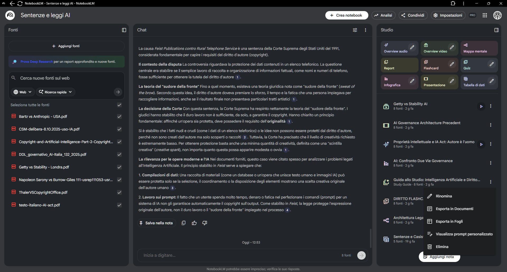 Le azioni possibili possono andare dal cambiare il nome allo scaricare il file, dalla visualizzazione alla condivisione fino alla cancellazione. Da notare che gli elementi in formato di documenti, presentazioni e tabelle dati, possono essere esportati come documenti e/o come tabelle nel Google Drive gestito con lo stesso account con cui si usa NotebookLM.