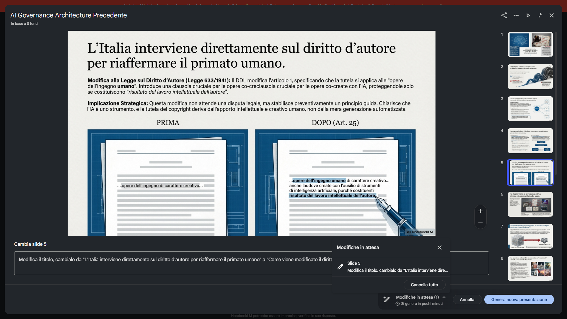 La presentazione può essere visualizzata direttamente in NotebookLM in modalità schermo intero, scaricata come PDF o condivisa tramite link.