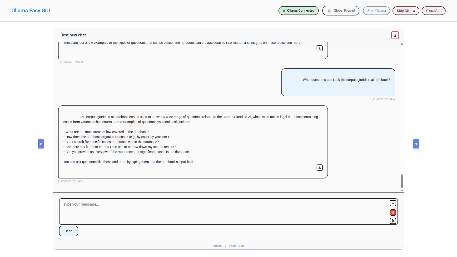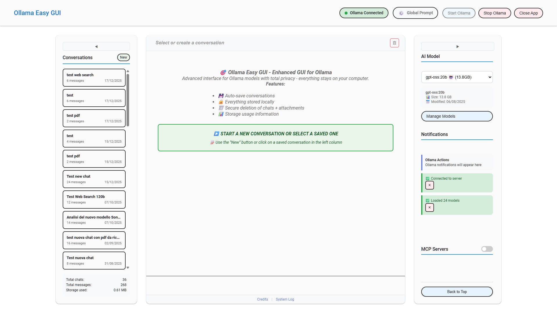 - Stato Ollama: indicatore visivo che mostra se il servizio Ollama è attivo o meno
